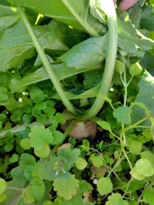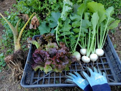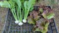 今週(11月24日)、関東南部の家庭菜園で収穫できた野菜は、かぶ4つ、リーフレタス7枚、紅芯大根1本、里芋1株でした。