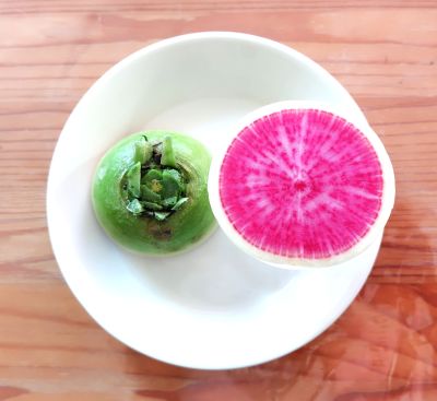 紅芯大根は輪切りにしたときの鮮やかな赤色が魅力です。辛味が少なめで、生サラダや浅漬けに向いています。